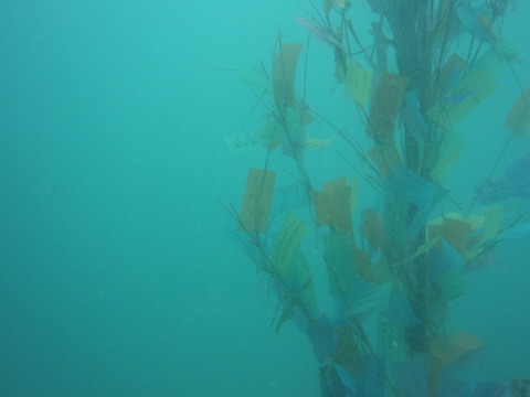 インストラクターに勧められて、水中の笹にお願いをぶら下げる。 お願いはズバリ『人魚に会えますように』。