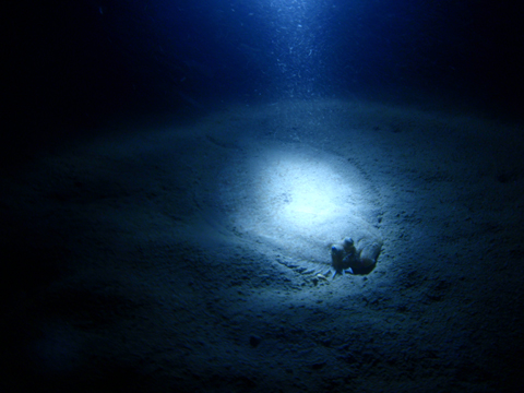 初めてのナイトダイビング。全然見えない(汗)。 ナイトは浮きやすくなるので、ウェイトを1kg多くするように勧められたが、意地を張って4kgのままにした。