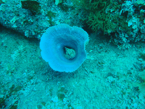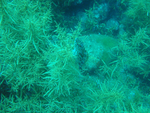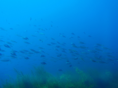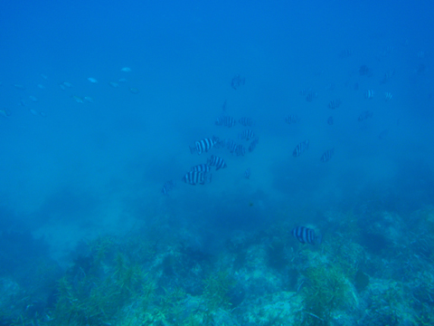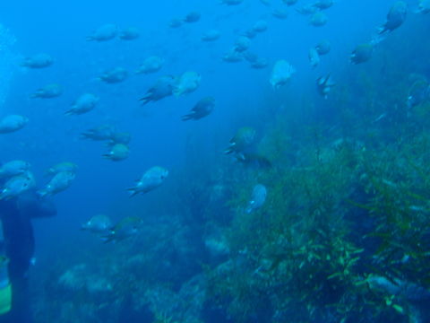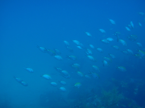 最初はすごく濁っていたけど、深く潜ると綺麗な透明度になった。 とにかくスズメダイが多かった。 ダイバーを怖がらずに目の前を群れで一列に横切るものだから、 そこをまっすぐ行っていいのか少し悩む。 魚に気を使ってどうするんだろう?って我ながら思った(笑)
