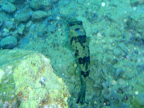 ちょっと変わったカワハギを発見。 最初はアミメハギかなぁとも思ったけど、あと調べて見ると縦縞2本はヨソギという種類であることを知った。