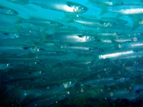ボラが水面を飛び跳ねているポイントに潜ったら、そこはボラだらけの世界だった。 100や200じゃなくて、見渡す限りボラだった。