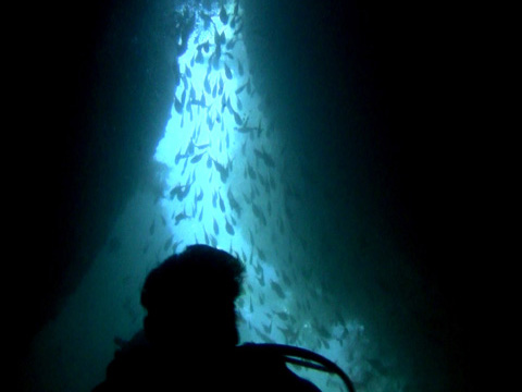 洞窟の出口の魚影が綺麗だった。