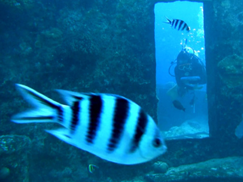 ヨスジフエダイやアカヒメジの群れを楽しんだり、扉をくぐり抜けたりして遊んでいた。