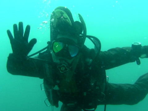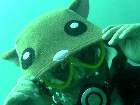 モモンガの着ぐるみでダイビング。 全然フィンキックが進まないのでびっくり。